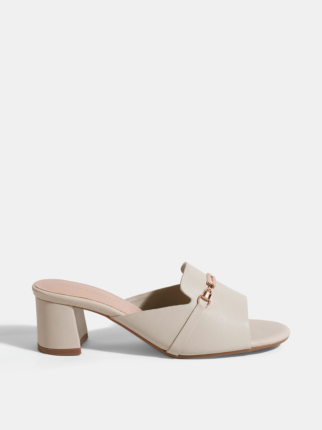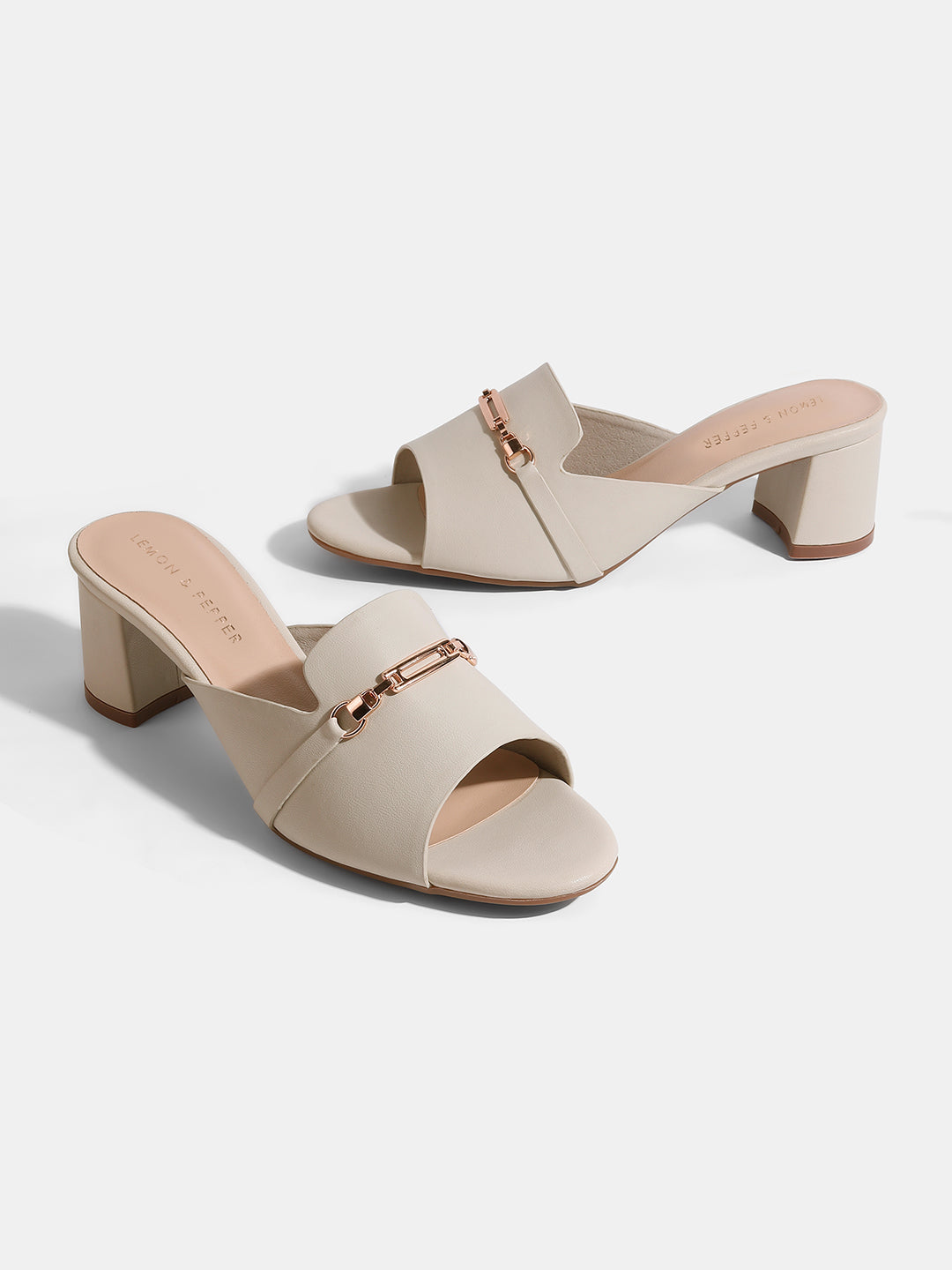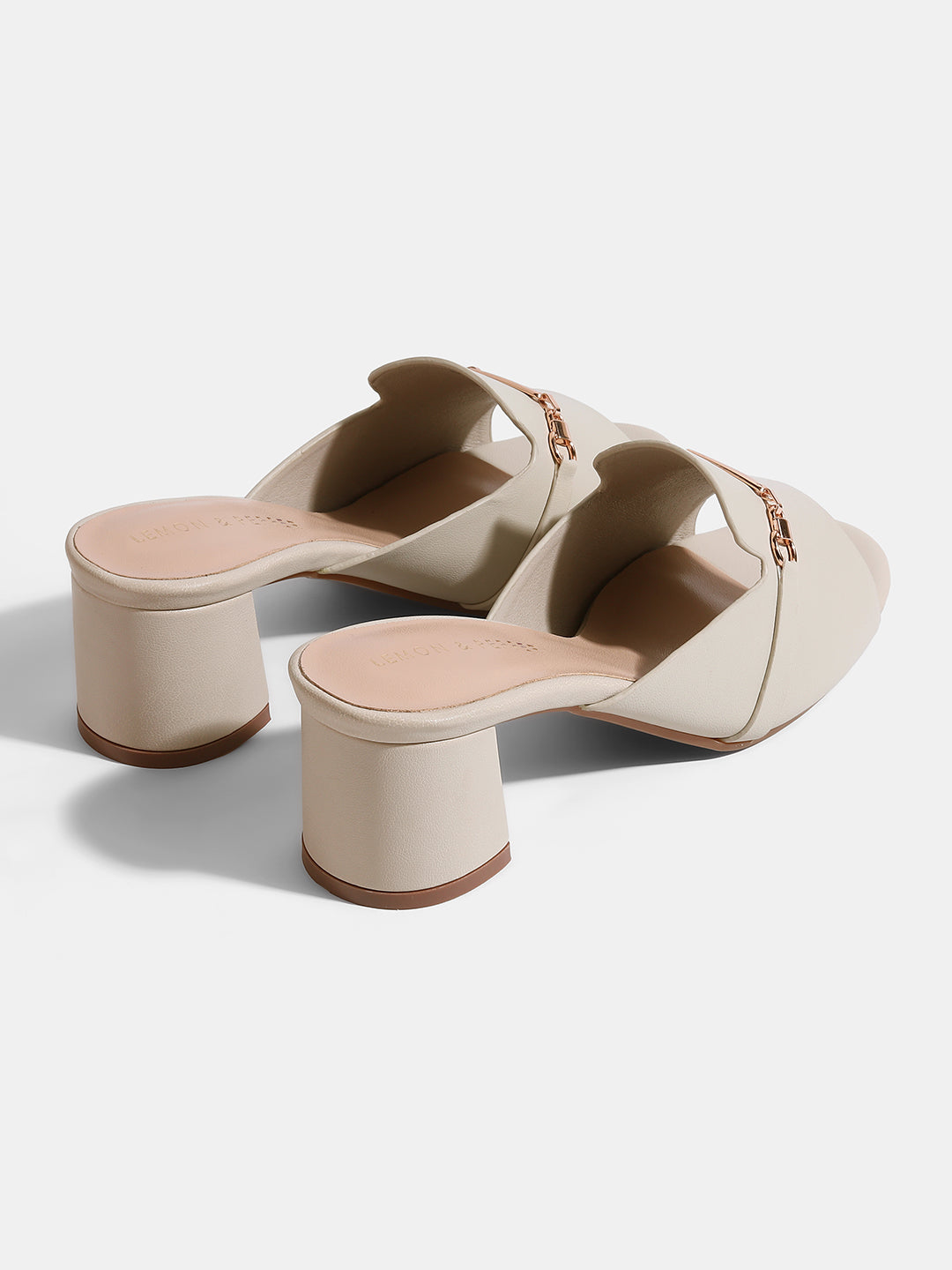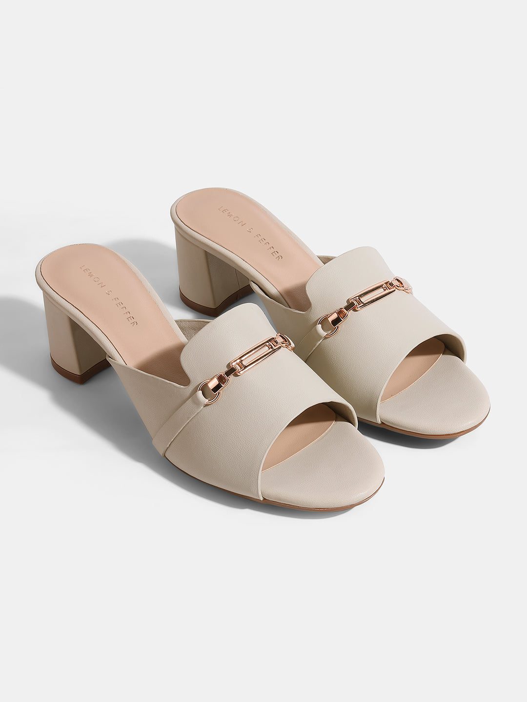 Any outfit would benefit from these chic lightgrey block heel mules. They add a glamorous touch with their wide, open-toe strap embellished with a stylish gold-toned chain detail. They are ideal for daytime and evening use because of the sturdy block heel, which offers a comfortable lift and stability.style tip : Style them with a solid-colored jumpsuit to let the lightgrey color and gold detail stand out.